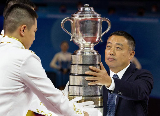 9月29日,中國乒協(xié)主席劉國梁(右)將男子團(tuán)體冠軍獎(jiǎng)杯——斯韋思林杯放在展臺上。新華社記者 江宏景 攝