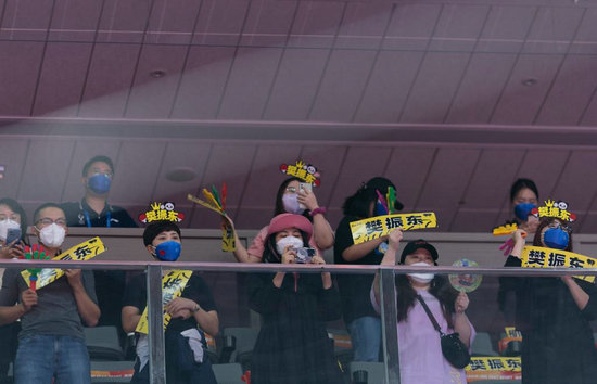 10月8日,現(xiàn)場觀眾為中國隊(duì)選手樊振東加油助威。新華社記者 江宏景 攝