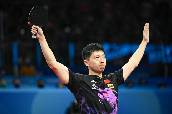 10月9日,中國隊(duì)選手馬龍?jiān)诒荣愔袘c祝勝利,他以3比1戰(zhàn)勝德國隊(duì)選手邱黨。新華社記者 劉續(xù) 攝