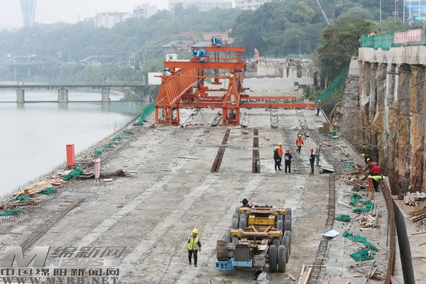 南河大橋下穿橋自去年12底施工以來,工程建設正穩(wěn)步推進。記者采訪了解到,位于南河大橋一側的下穿道路梁板架設已完成,板縫之間的鋼筋焊接和混凝土填充就緒,另一側的梁板架設正有序向前推進。在另一旁,建設者們正加緊對右側山體擋墻、排水廊道進行施工,為接下來進行最后一段橋面梁板架設贏得充足時間。