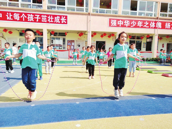 藍(lán)天幼兒園里孩子們正在跳繩