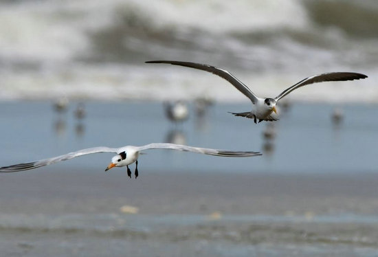 中華鳳頭燕鷗(左)和大鳳頭燕鷗在閩江河口國(guó)家濕地公園里翱翔覓食。新華社記者 魏培全 攝