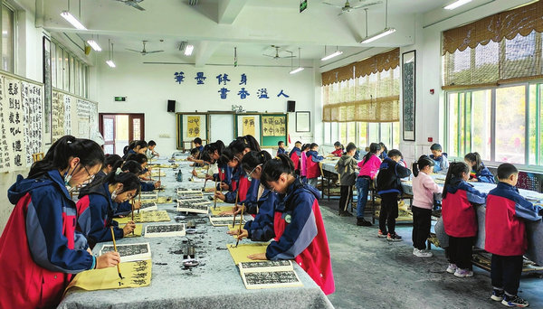 “學校書法教育之根本在于培養(yǎng)學生,在培訓教師的同時,學校書法教學以學生為本,制定年度書法教學計劃、書法教學中長期規(guī)劃,定時間、分層次、重梯隊對學生進行書法教育。”該校負責人何林表示,學校依托復興少年宮和課后延時服務,在普及書法的基礎上,從各年級選拔有一定書法基礎和濃厚興趣的同學參加書法社團,目前社團已達200余人。從2016年開始,學校推進書法教學進課堂,從小學一年級開始,學校免費提供毛筆書寫工具和紙張,每周在地方課程中開設一節(jié)書法課,讓學生系統(tǒng)學習書法基礎知識。此外,每周星期一、三下午正課前20分鐘,全校學生集中練習硬筆書法,全程由語文老師指導,做到軟筆與硬筆、理論與實踐結合。學校書法教育先后被央視“焦點訪談”、四川衛(wèi)視等多家媒體報道。俄羅斯青少年代表團蒞臨學校進行書畫交流,中央文明辦、省文明辦先后組織全國、全省鄉(xiāng)村少年宮學校代表5000余人到校參觀。