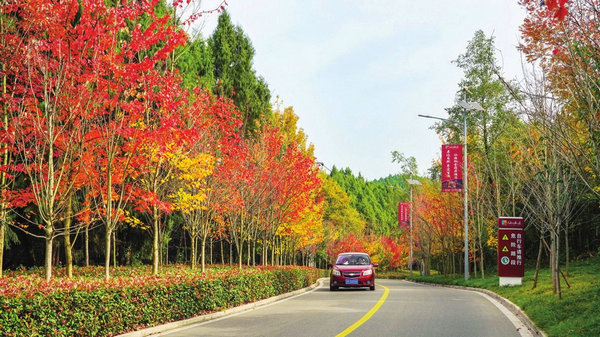 在一條條幽靜的景觀道路兩旁,高大的銀杏樹一身金黃,與火紅的楓葉、水杉相互交織,層林盡染,如同打翻的“調(diào)色盤”,潑染出一派繽紛絢麗的彩林。伴著陣陣微風(fēng),曬著溫暖陽光,游客徜徉其中,呼吸著沁人心脾的新鮮空氣,好似與大自然談了一場浪漫的“戀愛”。