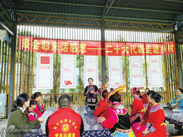 在單位宣講時(shí),“中華優(yōu)秀傳統(tǒng)文化創(chuàng)造性轉(zhuǎn)化、創(chuàng)新性發(fā)展”是大家關(guān)注的重點(diǎn)。在縣文廣旅局為機(jī)關(guān)黨員干部、非遺傳承人宣講時(shí),陳云珍談到將《各族兒女永遠(yuǎn)跟黨走》羌繡贈(zèng)送給黨的二十大秘書處的情景,各級(jí)領(lǐng)導(dǎo)對(duì)羌繡保護(hù)和發(fā)展的關(guān)心重視,讓大家備受鼓舞。北川文旅局黨組成員、機(jī)關(guān)黨委書記母志艷表示,要進(jìn)一步發(fā)揮文旅專合社等組織的牽頭引領(lǐng)作用,統(tǒng)籌推進(jìn)羌文化事業(yè)發(fā)展,將羌繡、羌歌、羌舞等羌族非遺技藝融入民俗展演,為農(nóng)戶創(chuàng)造持續(xù)增收動(dòng)能,真正讓傳統(tǒng)“活起來”、傳承“動(dòng)起來”、群眾“富起來”。