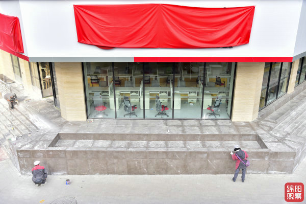 ↑12月18日,城區(qū)天津橋一側(cè),裝修中的門面上掛上了大紅布。