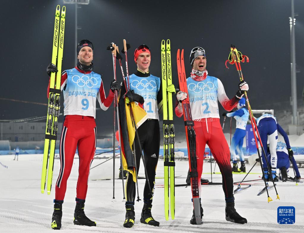 2月9日,冠軍德國選手文岑茨·蓋格爾(中)、亞軍挪威選手約根·格拉巴克(左)與季軍奧地利選手盧卡斯·格賴德雷爾賽后合影。