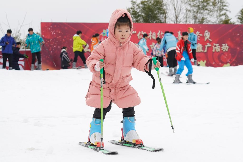 1月14日,小朋友在江蘇省淮安市古運(yùn)河滑雪場體驗(yàn)滑雪。新華社記者李博攝