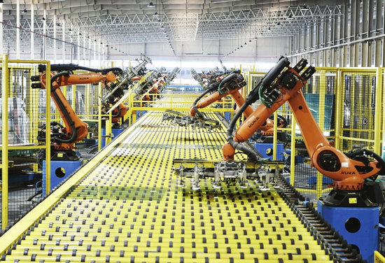 如今,我國(guó)已轉(zhuǎn)向高質(zhì)量發(fā)展階段,科技創(chuàng)新已經(jīng)成為建設(shè)創(chuàng)新型國(guó)家的關(guān)鍵要素和依靠力量。站在新的歷史起點(diǎn)上,我們要堅(jiān)定創(chuàng)新自信,努力實(shí)現(xiàn)高水平科技自立自強(qiáng),以一往無(wú)前的奮進(jìn)姿態(tài),向著科技強(qiáng)國(guó)建設(shè)的目標(biāo)闊步前進(jìn)。圖為在福建省福清市的福耀玻璃集團(tuán)汽車玻璃生產(chǎn)車間,機(jī)械手在生產(chǎn)線上作業(yè)。(據(jù)新華社)