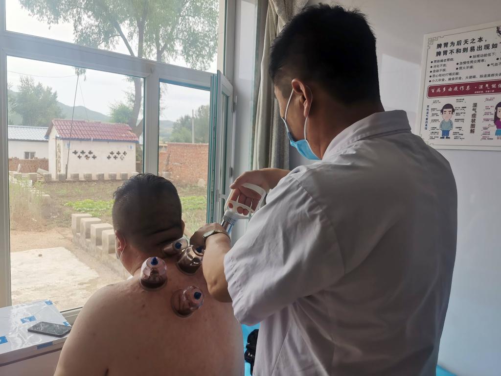 突泉縣寶石鎮(zhèn)寶龍村衛(wèi)生室村醫(yī)李朝輝(右)為村民進(jìn)行拔罐治療。新華社記者 魏婧宇 攝