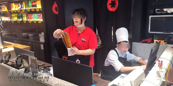 記者進(jìn)入餐廳內(nèi)部看到,雖然店員都戴了口罩,但至少有4人將口罩拉到了下頜處,其中1名還戴著廚師長(zhǎng)的帽子(如圖)。記者隨后返回餐廳入口,此時(shí)門(mén)口值守人員正在查驗(yàn)3名顧客的“兩碼”,其中1名沒(méi)戴口罩的顧客在登記信息后順利進(jìn)入了餐廳。