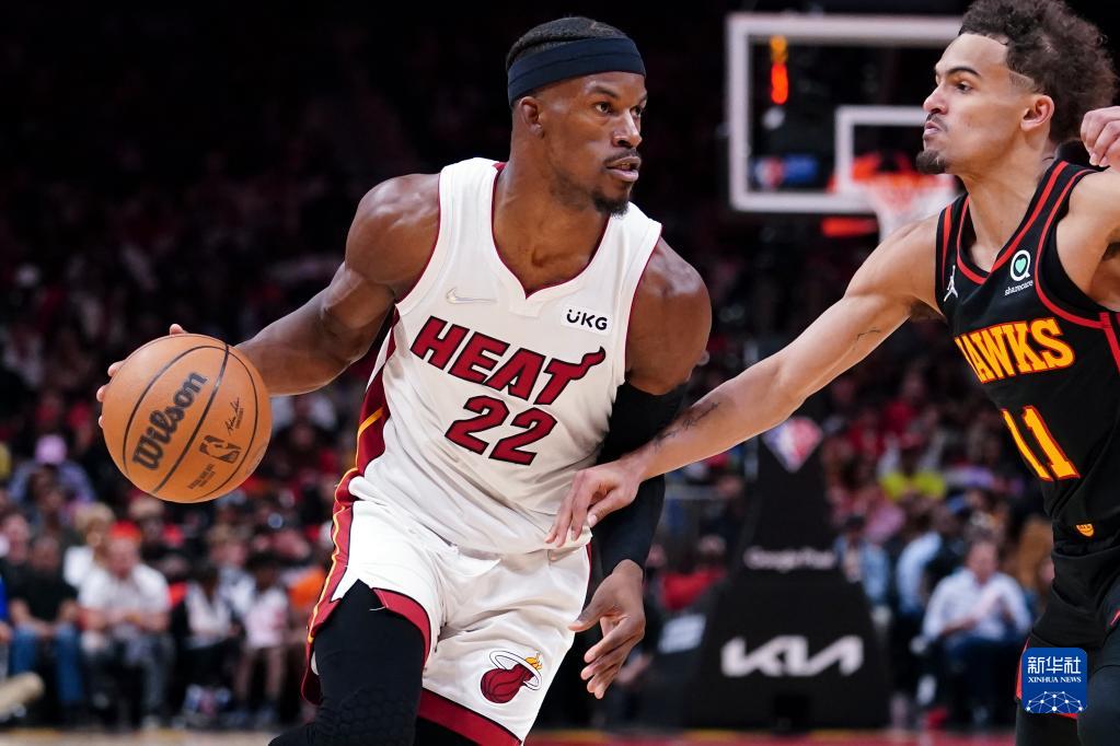4月24日,熱火隊(duì)球員巴特勒(左)帶球突破。新華社/美聯(lián)