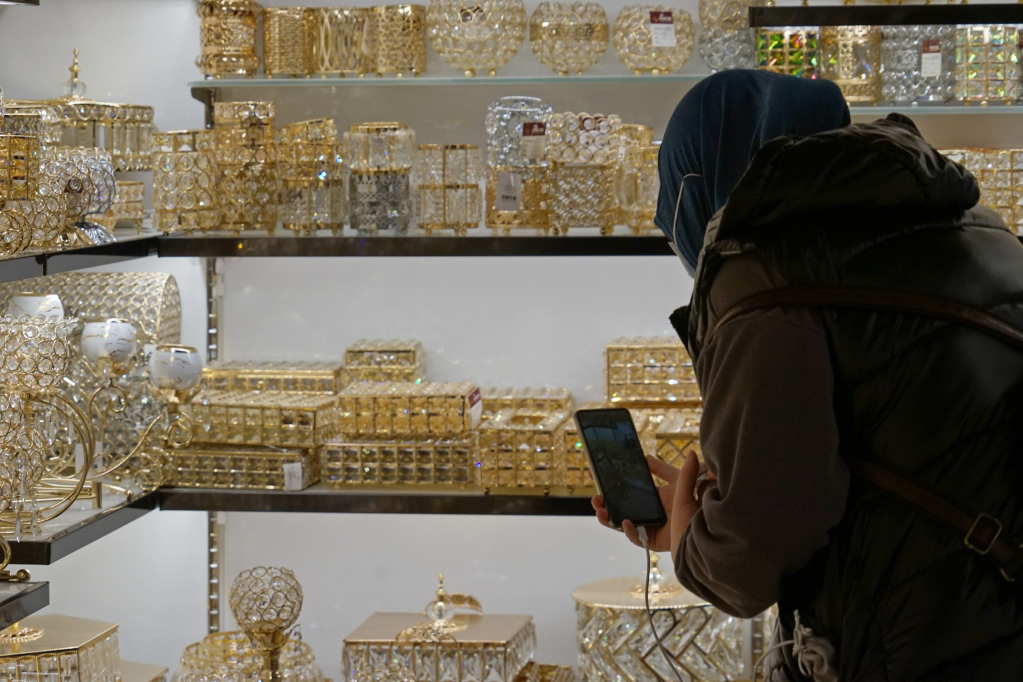 義烏國(guó)際商貿(mào)城一家水晶商鋪內(nèi),業(yè)務(wù)員小丁正在貨架前進(jìn)行遠(yuǎn)程視頻連線,手機(jī)的另一頭連著巴勒斯坦。受疫情影響,海外客商來華不便,遠(yuǎn)程直播成為其采購之“眼睛”。“客戶擔(dān)心這個(gè)燈臺(tái)尺寸比較大,運(yùn)費(fèi)會(huì)不會(huì)比較貴?”業(yè)務(wù)員小丁問。“沒問題,主體和燈座可以拆卸,包裝不占空間。”商鋪負(fù)責(zé)人劉榮斌立即回復(fù)。