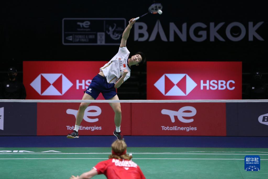 5月11日,中國隊(duì)選手李詩灃在比賽中回球。他在男單比賽中以2比1戰(zhàn)勝丹麥隊(duì)選手安東森。新華社記者 王騰 攝