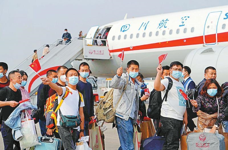 川籍務(wù)工人員乘坐農(nóng)民工返崗專機回廣州上班。 四川在線記者 華小峰 攝(資料圖)