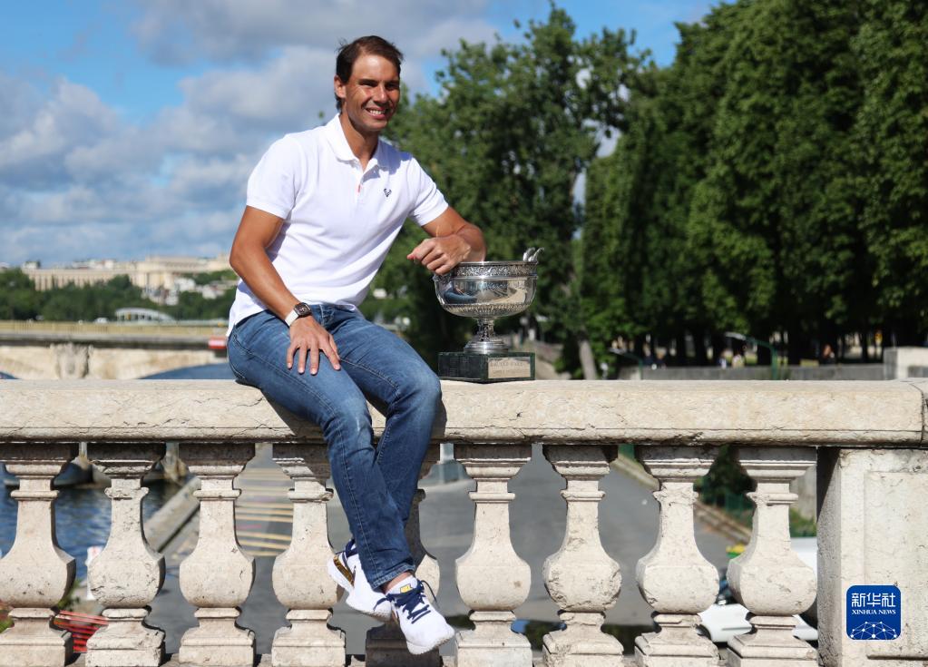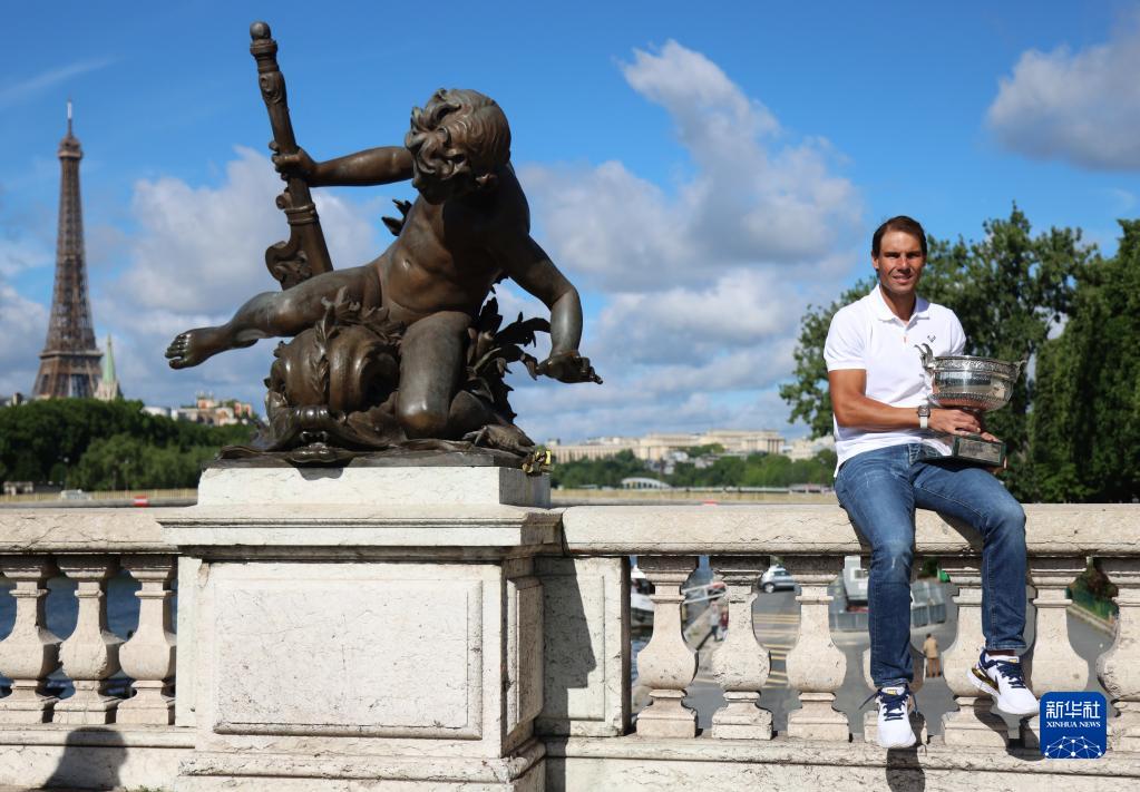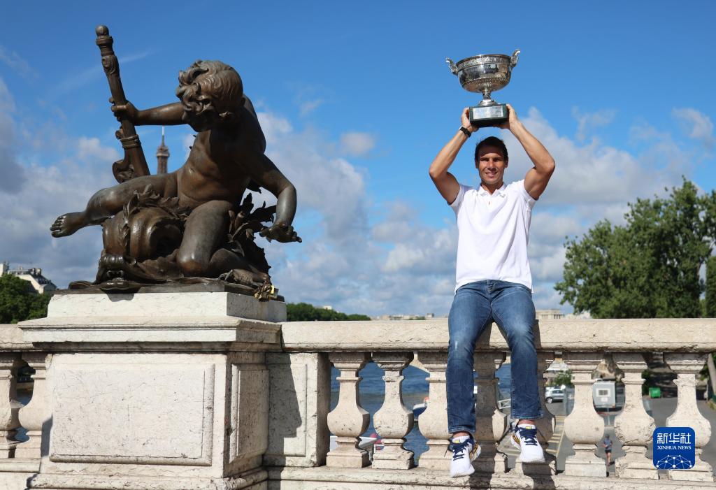 6月6日,納達(dá)爾手扶獎杯在巴黎亞歷山大三世橋合影留念。新華社記者高靜攝