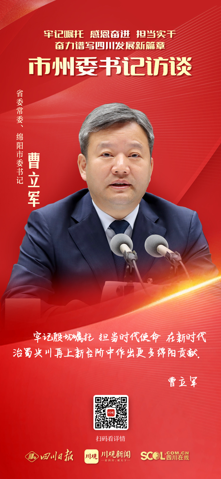 6月8日,習近平總書記來四川視察,明確提出了當前和今后一個時期統(tǒng)攬治蜀興川各項工作的總體要求。5月27日—30日,中國共產(chǎn)黨四川省第十二次代表大會召開,給綿陽明確了新定位、提出了新要求。作為中國唯一科技城、全省第二大經(jīng)濟體,綿陽將如何把握當前和未來形勢?如何設定發(fā)展戰(zhàn)略?具體工作怎么干?近日,記者專訪了省委常委、綿陽市委書記曹立軍?! ?/p>