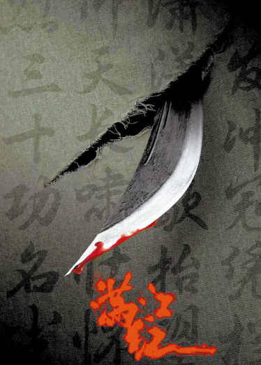 在影片概念海報上,寫著《滿江紅·怒發(fā)沖冠》詞句的屏風被一把鮮血淋漓的彎刀刺破,鮮紅的“滿江紅”三個大字力透紙背。整張海報色調陰暗,充滿懸念,透過刀縫窺見的屏風之后,一片黑暗,讓人想要一探究竟。