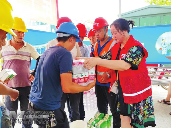 7月7日,涪城區(qū)華豐社區(qū)新時代文明實踐的志愿者們走進工地,為奮戰(zhàn)在一線的建筑工人送去了礦泉水、藿香正氣液等防暑降溫物品?!?潘曉莉 綿報融媒記者 陳冬冬 攝)