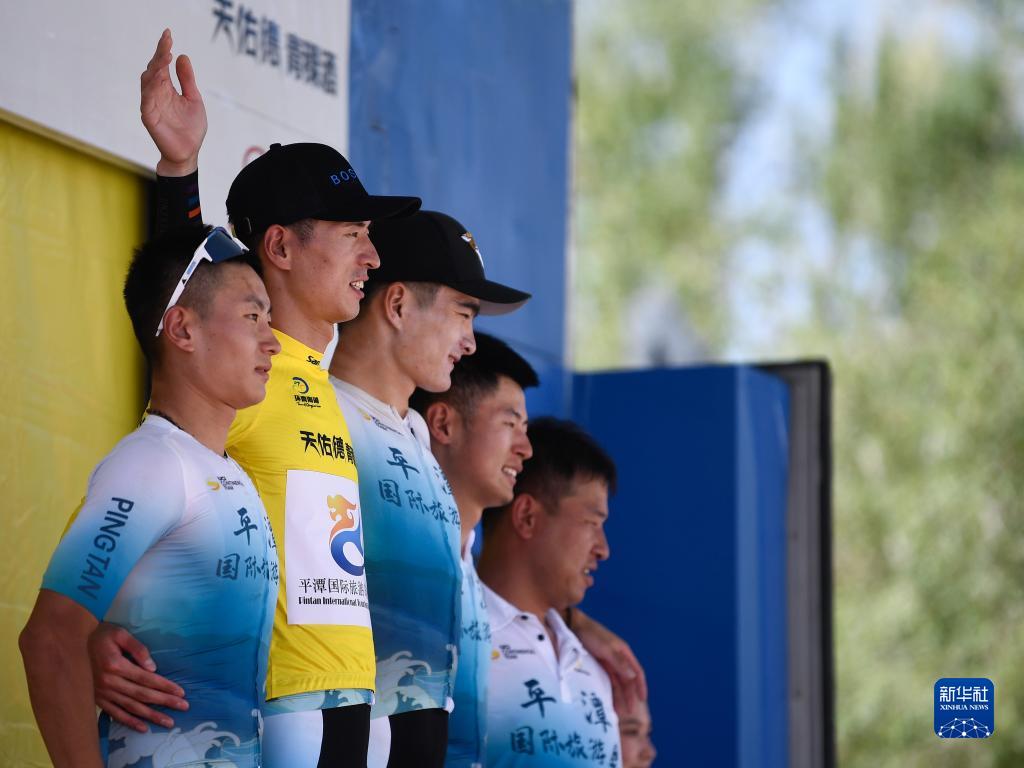 8月3日,劉建坤(左二)身著代表個人總成績第一名的黃色領(lǐng)騎衫在領(lǐng)獎臺上與隊友合影。新華社記者張龍攝