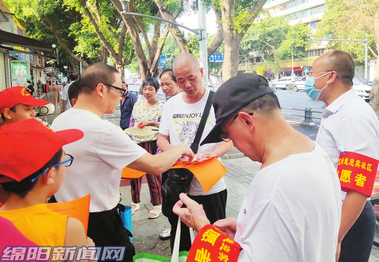 社區(qū)工作人員向路人宣講創(chuàng)建知識