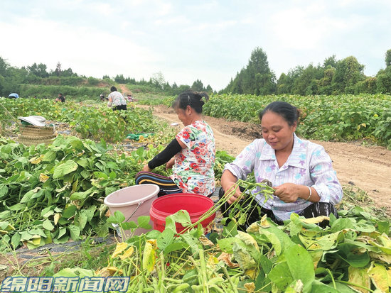 綿陽(yáng)新聞網(wǎng)訊 近日,在三臺(tái)縣西平鎮(zhèn)紅梁村一片綠意盎然的田地里,隨處可見(jiàn)村民采摘、搬運(yùn)大豆忙碌的身影,一幅幅多彩的豐收畫(huà)卷在這里展開(kāi)。高聳的玉米還為村民們形成天然的遮陽(yáng)傘,大家抓緊時(shí)間搶收。