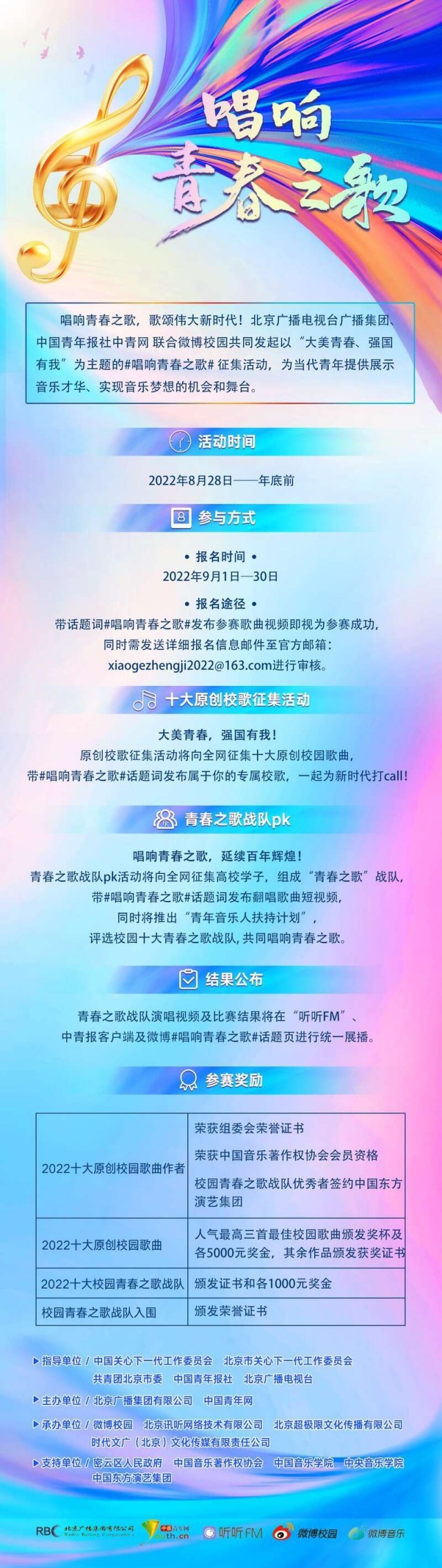 8月28日,首屆新時(shí)代校園歌曲征集展播活動(dòng)暨校園青春之歌戰(zhàn)隊(duì)大賽啟動(dòng)?;顒?dòng)由北京廣播集團(tuán)與中國(guó)青年網(wǎng)主辦,以“大美青春、強(qiáng)國(guó)有我”為主題,通過微博話題#唱響青春之歌#,向全網(wǎng)征集原創(chuàng)校園歌曲。中國(guó)關(guān)心下一代工作委員會(huì)、北京市關(guān)心下一代工作委員會(huì)、共青團(tuán)北京市委、中國(guó)青年報(bào)社、北京廣播電視臺(tái)具體指導(dǎo)活動(dòng)開展。