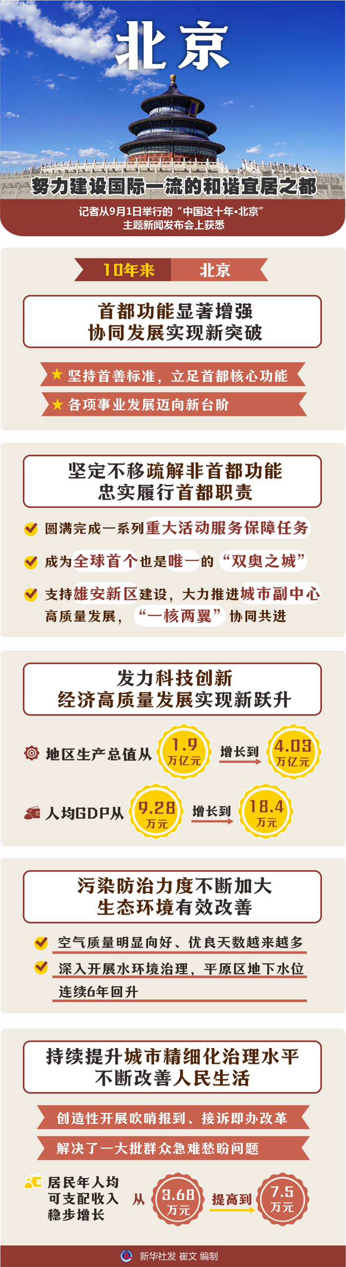 新華社北京9月1日電(記者王君璐)記者從1日舉行的“中國(guó)這十年·北京”主題新聞發(fā)布會(huì)上獲悉,黨的十八大以來,北京深入貫徹落實(shí)習(xí)近平總書記重要指示精神,全市上下牢記囑托、勇?lián)姑?,全面貫徹新發(fā)展理念,融入新發(fā)展格局,求真務(wù)實(shí)、砥礪奮進(jìn),努力建設(shè)國(guó)際一流的和諧宜居之都,在全面建設(shè)社會(huì)主義現(xiàn)代化國(guó)家新征程上奮力譜寫首都發(fā)展新篇章。