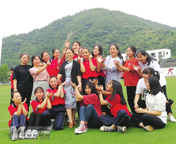 吳萍芳(中)與學(xué)生在操場合影(圖片由受訪者提供)