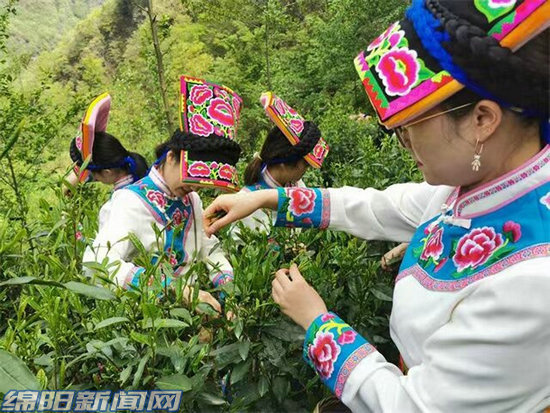 羌族姑娘在蓋頭山采茶