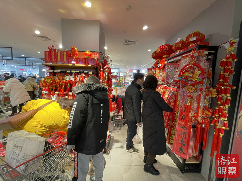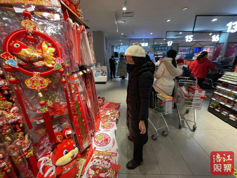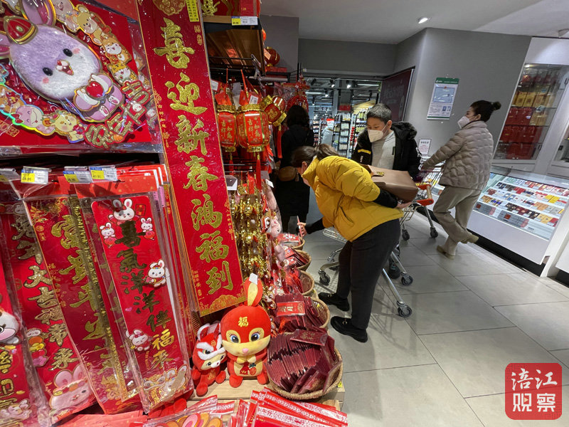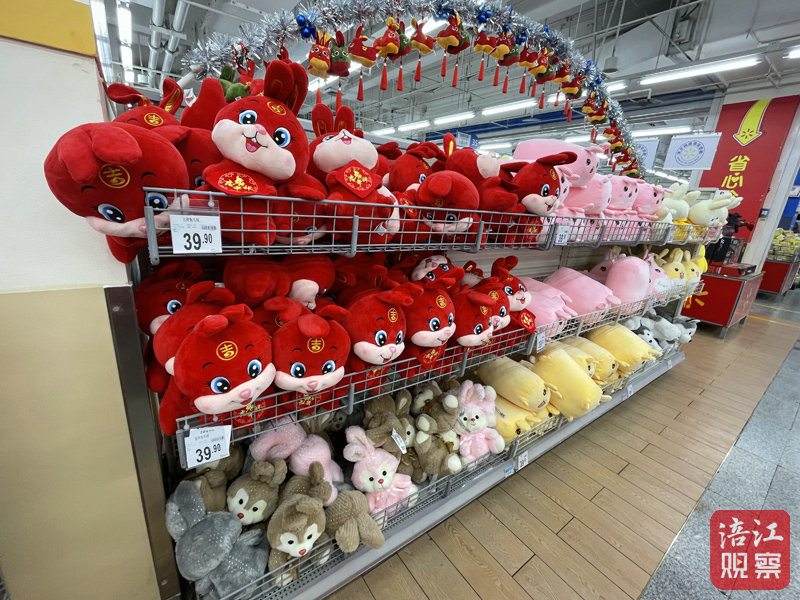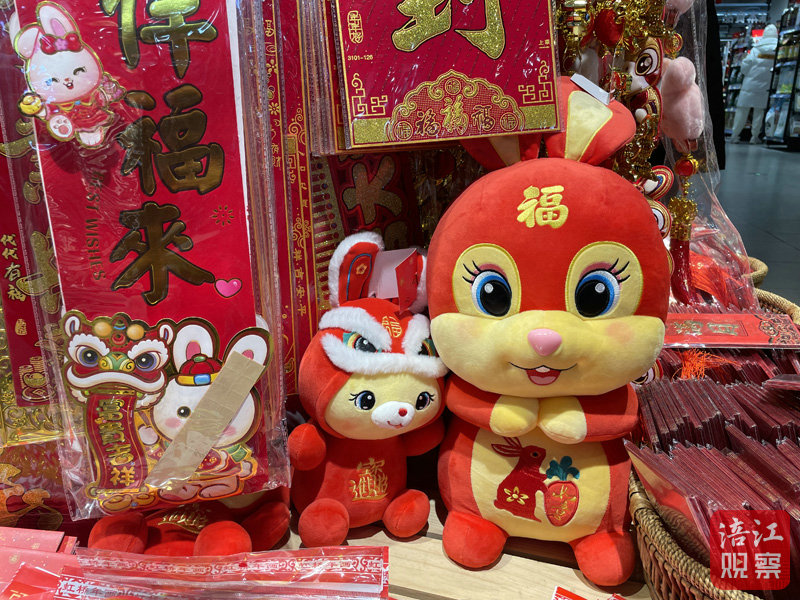 超市工作人員告訴記者,過年前夕是春節(jié)飾品的熱銷旺季,超市從元旦節(jié)之前就開始上架兔年商品了,目前的銷售爆品是一款穿唐裝的兔子玩偶。除此之外,記者注意到“兔年限定”的堅果、糖果、零食禮盒等傳統(tǒng)年貨也已上架。