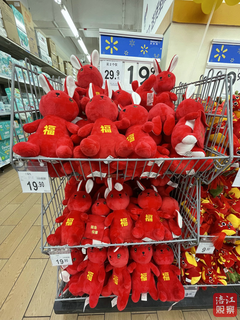 1月11日下午3時,記者來到沃爾瑪超市建國門店看到,造型各異的“兔元素”裝飾品被擺在了超市的年貨專區(qū),春聯(lián)、福字、生肖年畫、燈籠等新年商品令人目不暇接。“這些萌兔簡直太可愛了!”正在選購商品的市民方女士說,“我侄女生肖屬兔,所以我買了一對兔子玩偶送給她。”