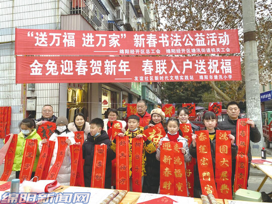 1月14日,友誼社區(qū)聯(lián)手塘汛小學(xué)開(kāi)展“金兔迎春賀新年春聯(lián)入戶(hù)送祝福”活動(dòng),把濃濃的年味和新春的祝福送給轄區(qū)居民?;顒?dòng)中,塘汛小學(xué)的老師、學(xué)生們揮毫潑墨,一張張力透紙背的“福”字和一副副對(duì)仗工整、寓意吉祥的春聯(lián),帶著濃濃的墨香,洋溢著新春的喜氣,志愿者們幫忙將寓意吉祥的春聯(lián)和“福”字送到居民手中,大家臉上洋溢著喜悅的笑容。