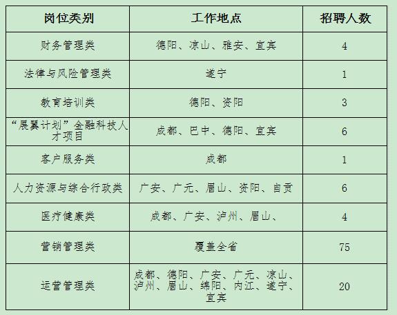 四川省公司省本部及下轄機(jī)構(gòu)共計(jì)擬招聘120人,崗位涵蓋“展翼計(jì)劃”銷售管理人才項(xiàng)目、“展翼計(jì)劃”金融科技人才項(xiàng)目、營銷管理類、醫(yī)療健康類、運(yùn)營管理類、財(cái)務(wù)管理類、客戶服務(wù)類、法律與風(fēng)險(xiǎn)管理類、教育培訓(xùn)類、人力資源與綜合行政類等各類崗位,工作地點(diǎn)覆蓋全省。