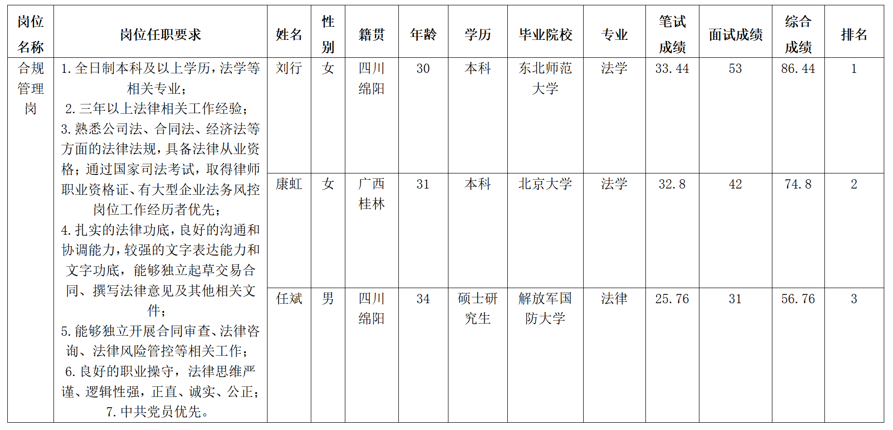 根據綿陽燃氣集團有限公司發(fā)布的招聘公告及招聘相關規(guī)定,經筆試、面試等程序,現將綜合成績予以公示。