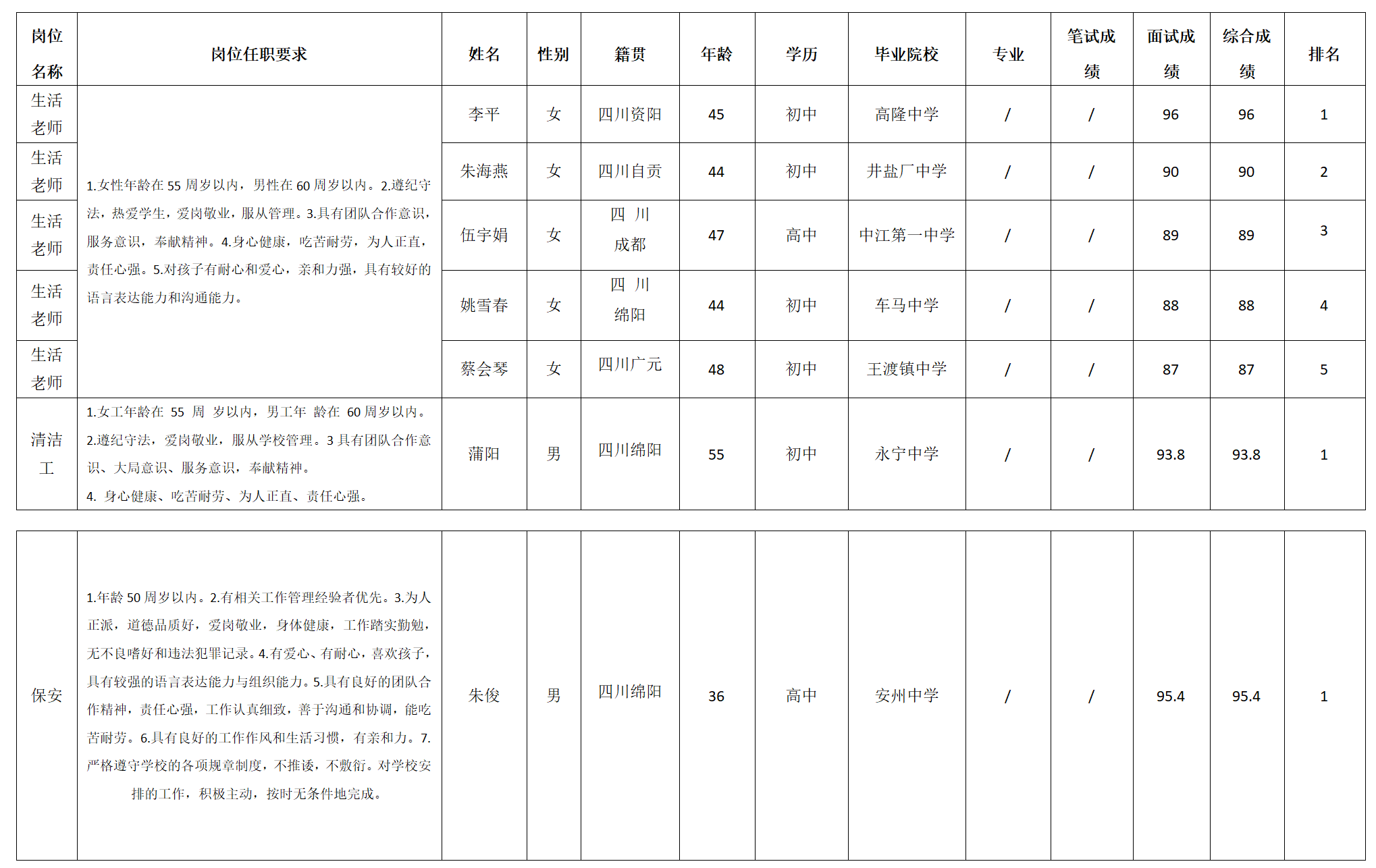 根據(jù)綿陽中學(xué)實(shí)驗(yàn)學(xué)校發(fā)布的招聘公告及招聘相關(guān)規(guī)定,經(jīng)面試等程序,現(xiàn)將成績予以公示。