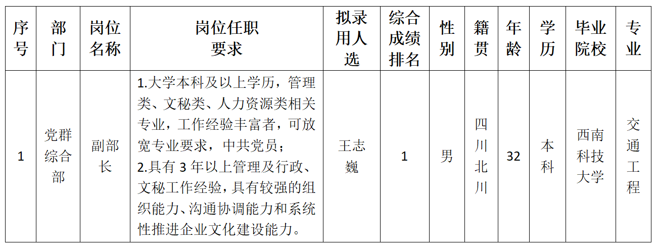 根據(jù)大道供應(yīng)鏈公司選聘公告及中層管理人員選拔任用相關(guān)規(guī)定,經(jīng)筆試、面試、考察、體檢等程序,擬錄用王志巍同志到四川大道致遠供應(yīng)鏈管理有限責(zé)任公司工作,現(xiàn)予以公示,具體情況如下: