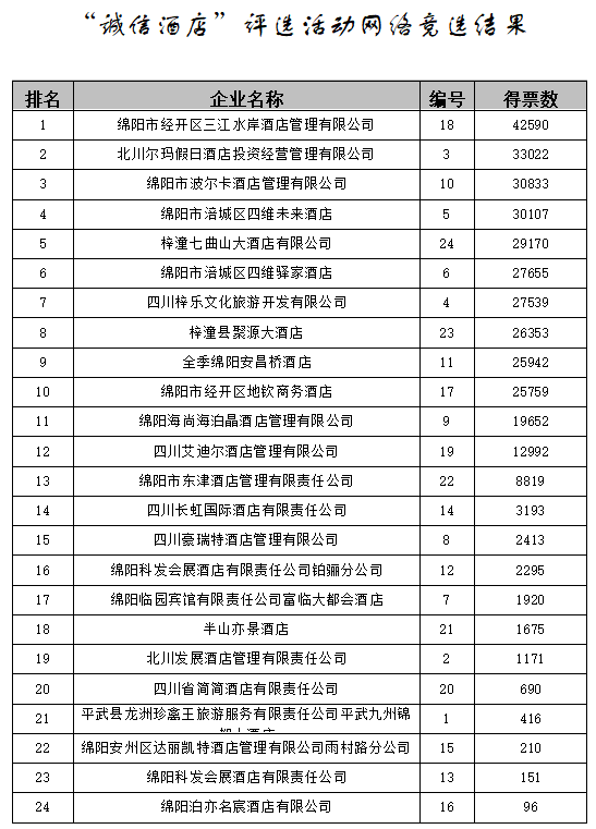 按照《綿陽市“誠信商超(酒店、餐飲)”評選活動方案》,2023年10月14日00:00:00至10月20日23:59:59,開展了“誠信商超(酒店、餐飲)”網(wǎng)絡(luò)競選,現(xiàn)將結(jié)果進(jìn)行公示。