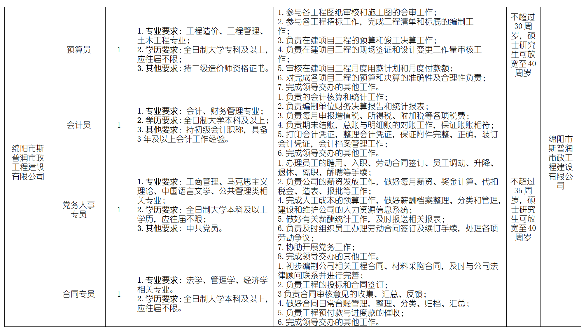 2.綿陽市斯普潤市政工程建設有限公司:預算員1名、會計1名、黨務人事專員1名、合同專員1名、施工員崗1名。