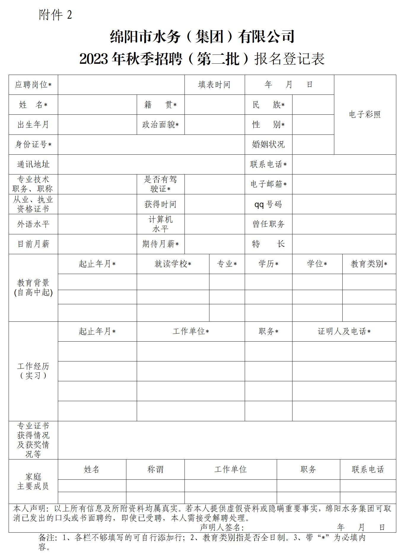 1.應聘人員于報名時間截止前,按照公布的報考條件和職位要求,如實填寫《2023年秋季招聘(第二批)報名登記表》(附件2),并將電子版報名登記表(含近期2寸證件照電子照片)及身份證、教育部認證學籍學歷證明(留學歸國人員應出具國家教育部國〈境〉外學籍學歷認證書)、職(執(zhí))業(yè)資格證、專業(yè)技術資格證書等證明材料、工作(實習)經(jīng)歷證明等相關資料掃描件,打包壓縮后以“報考職位名稱+姓名+聯(lián)系電話”命名,通過電子郵件發(fā)送至郵箱water.hr.my@163.com。