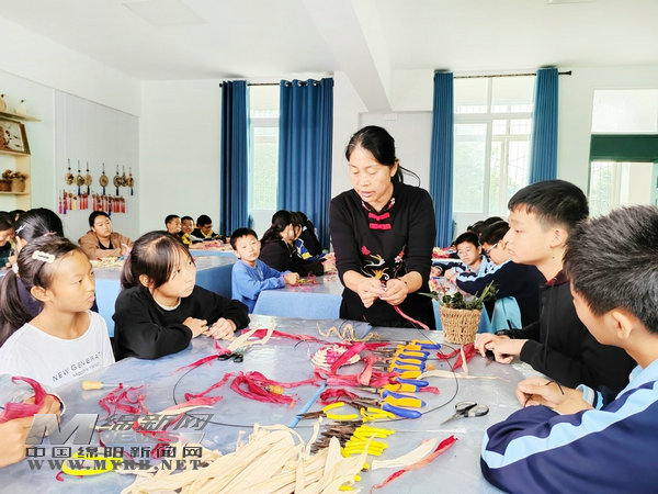 在另一間教室里,同學(xué)們正跟隨“江油草編”代表性傳承人何桂容學(xué)習(xí)草編技藝。“草編的原材料就在我們身邊,取之不盡用之不竭……希望大家學(xué)好草編,個個都成為‘變廢為寶’的環(huán)保達人。”何桂容隨手拾起一絲棕葉,向同學(xué)們示范草編的基本技法。她將手里的棕葉壓扁,多根結(jié)合層層編扣,巧手舞動中,一只活靈活現(xiàn)的小動物便呈現(xiàn)在大家眼前。