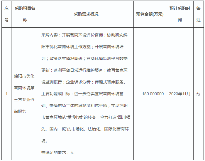 為便于供應(yīng)商及時了解政府采購信息,根據(jù)《四川省財政廳關(guān)于開展政府采購意向公開工作的通知》(川財采〔2021〕153號)要求,現(xiàn)將綿陽市政務(wù)服務(wù)監(jiān)督管理局2023年度(第6批)采購意向公開如下: