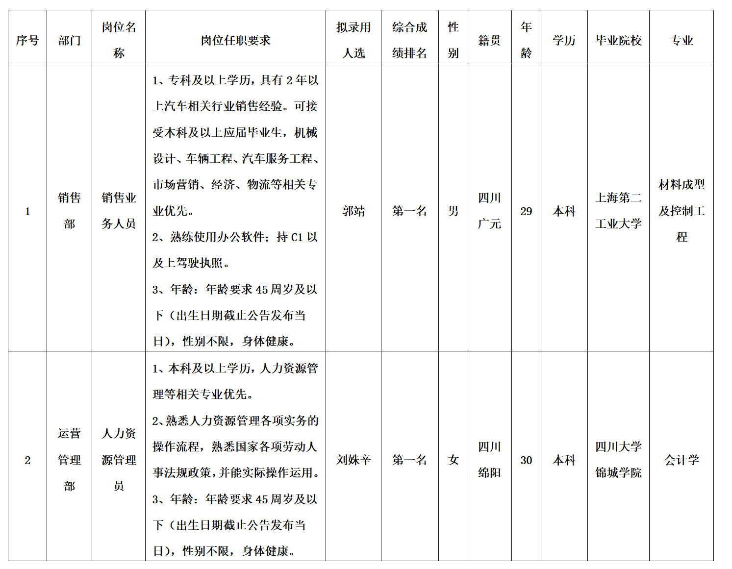 根據(jù)中國(guó)重汽集團(tuán)綿陽(yáng)專用汽車有限公司發(fā)布的招聘公告及招聘相關(guān)規(guī)定,經(jīng)面試、考察、體檢等程序,擬錄用郭靖同志為銷售業(yè)務(wù)人員,擬錄用劉姝辛同志為人力資源管理員,現(xiàn)予以公示,具體情況如下: