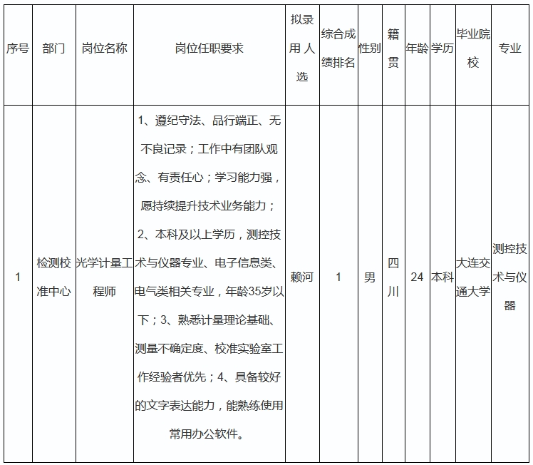 根據(jù)四川啟??丝萍加邢薰景l(fā)布的招聘公告及招聘相關(guān)規(guī)定,經(jīng)筆試、面試、考察、體檢等程序,擬錄用賴河同志到檢測校準中心工作,現(xiàn)予以公示,具體情況如下: