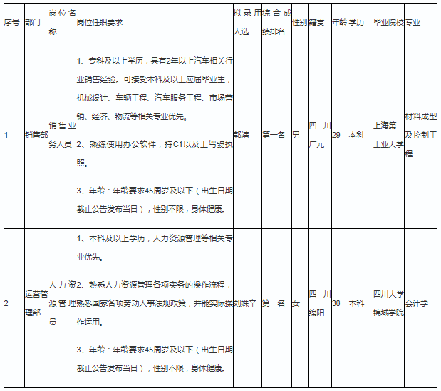 根據(jù)中國重汽集團綿陽專用汽車有限公司發(fā)布的招聘公告及招聘相關(guān)規(guī)定,經(jīng)面試、考察、體檢等程序,擬錄用郭靖同志為銷售業(yè)務人員,擬錄用劉姝辛同志為人力資源管理員,現(xiàn)予以公示,具體情況如下: