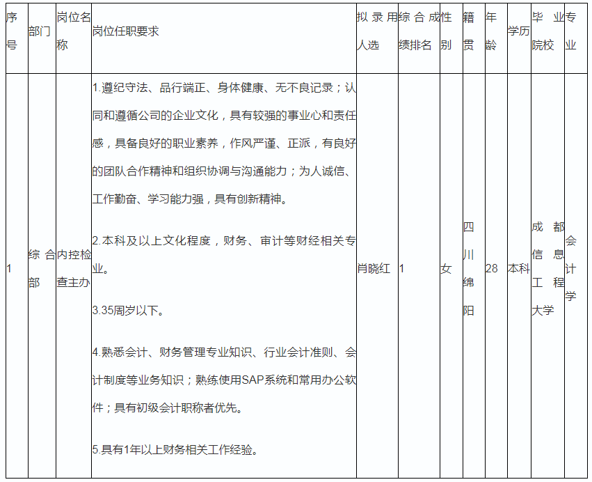 根據(jù)股份財務(wù)云中心發(fā)布的招聘公告及招聘相關(guān)規(guī)定,經(jīng)面試、考察、體檢等程序,擬錄用肖曉紅同志到股份財務(wù)云中心綜合部內(nèi)控組工作,現(xiàn)予以公示,具體情況如下: