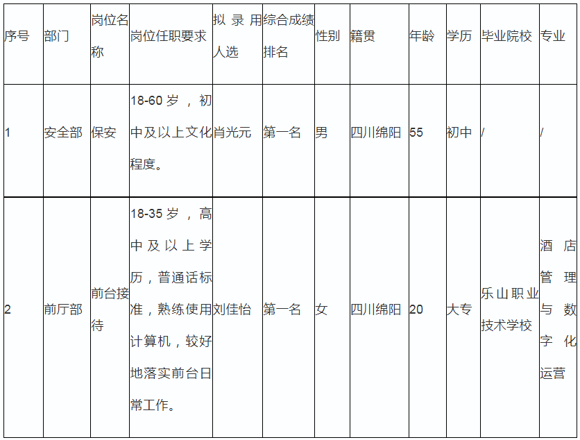 根據(jù)綿陽市綿州嘉來會務(wù)服務(wù)有限公司發(fā)布的招聘公告及招聘相關(guān)規(guī)定,經(jīng)面試、體檢等程序,錄用以下人員到綿陽市綿州嘉來會務(wù)服務(wù)有限公司工作,現(xiàn)予以公示,具體情況如下: