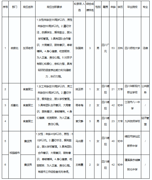 注:“生活老師”崗位綜合成績(jī)排名第1名與綜合成績(jī)排名2第二名兩名同志已自愿放棄。