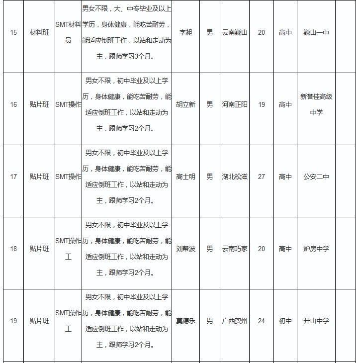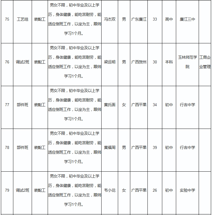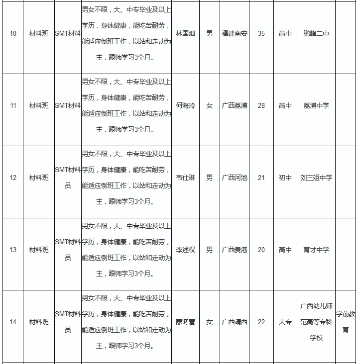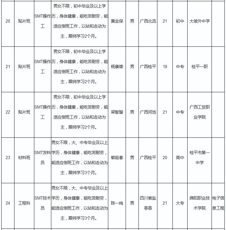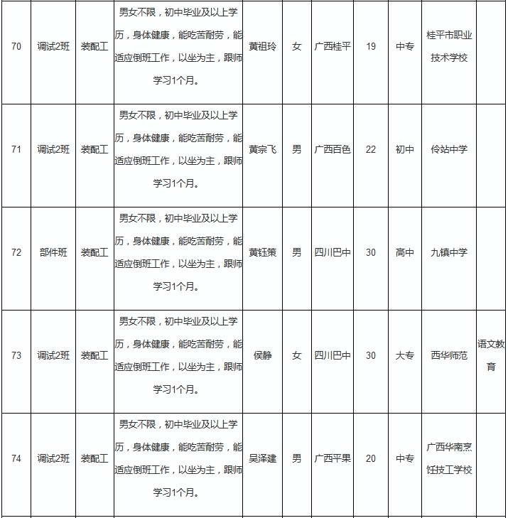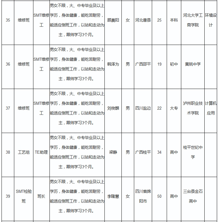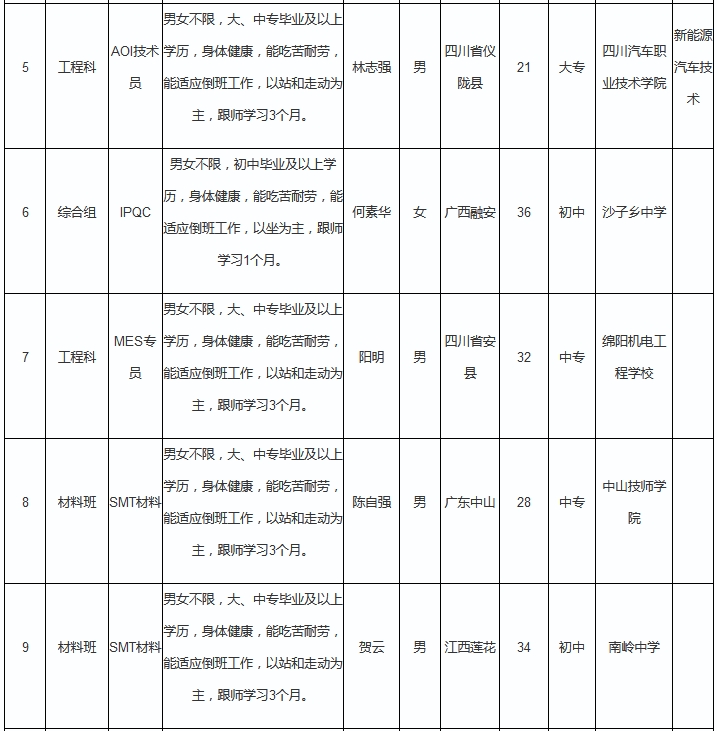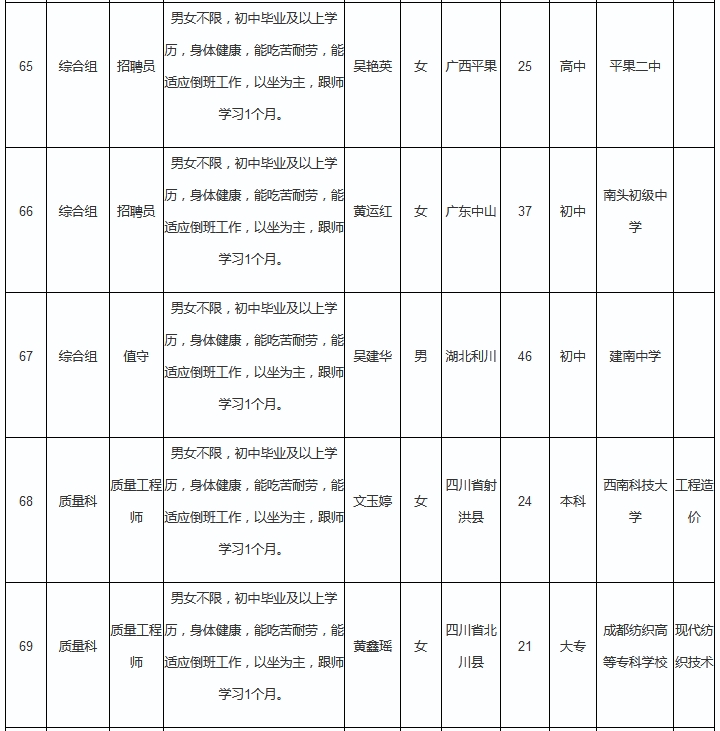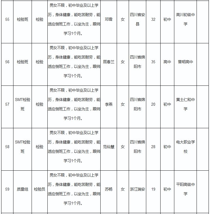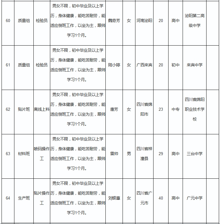 根據(jù)四川長虹精密電子科技有限公司發(fā)布的操作職招聘公告及招聘相關(guān)規(guī)定,從2023年7月1日至2023年10月31日經(jīng)面試、考察、體檢等程序,擬錄用以下85位同志到四川長虹精密電子科技有限公司操作職崗位工作,現(xiàn)予以公示,具體情況如下: