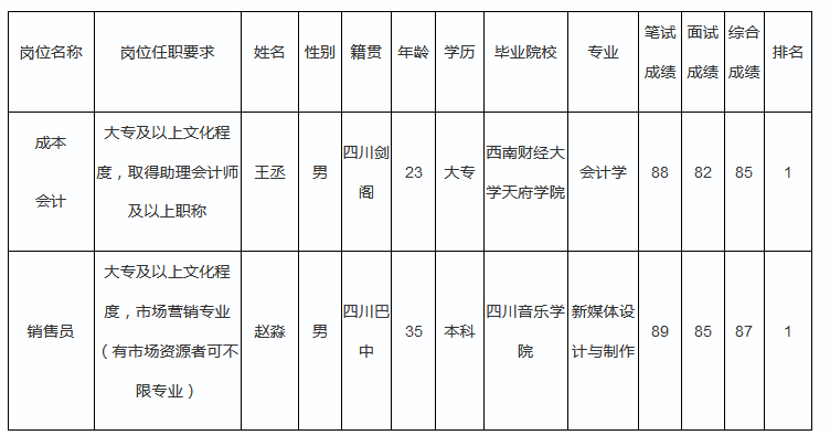 根據(jù)零八一電子集團四川力源電子有限公司發(fā)布的招聘公告及招聘相關(guān)規(guī)定,經(jīng)筆試、面試等程序,現(xiàn)將筆試(面試)成績予以公示。